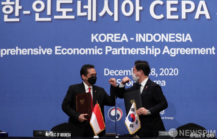[서울=뉴스핌] 백인혁 기자 = 성윤모 산업통상자원부 장관(오른쪽)과 아구스 수파르만토(Agus Suparmanto) 인도네시아 무역부 장관이 18일 오전 서울 중구 롯데호텔에서 열린 한-인도네시아 CEPA(Comprehensive Economic Partnership Agreement Signing Ceremony) 서명식에서 협약서에 서명을 마친 뒤 팔꿈치 인사를 하고 있다. 한국과 인도네시아 양국은 역내포괄적경제동반자협정(RCEP)에 이어 포괄적 경제동반자협정(CEPA)까지 성사시키며 양국간 무역장벽을 크게 낮췄다. 2020.12.18 dlsgur9757@newspim.com