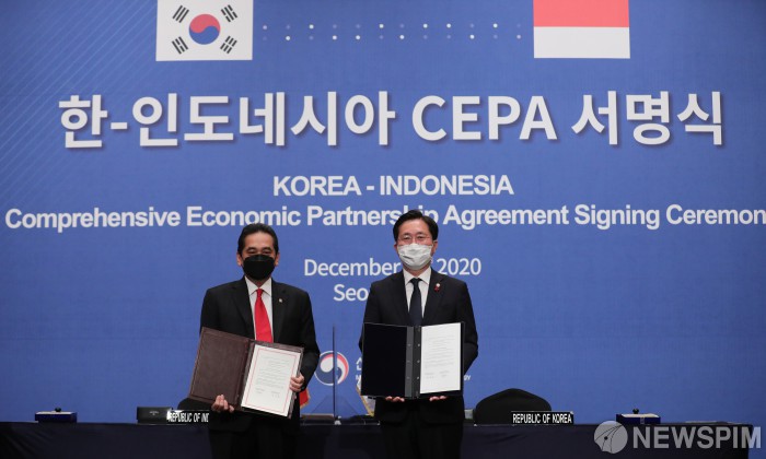 [서울=뉴스핌] 백인혁 기자 = 성윤모 산업통상자원부 장관(오른쪽)과 아구스 수파르만토(Agus Suparmanto) 인도네시아 무역부 장관이 18일 오전 서울 중구 롯데호텔에서 열린 한-인도네시아 CEPA(Comprehensive Economic Partnership Agreement Signing Ceremony) 서명식에서 협약서에 서명을 마친 뒤 기념촬영을 하고 있다. 한국과 인도네시아 양국은 역내포괄적경제동반자협정(RCEP)에 이어 포괄적 경제동반자협정(CEPA)까지 성사시키며 양국간 무역장벽을 크게 낮췄다. 2020.12.18 dlsgur9757@newspim.com