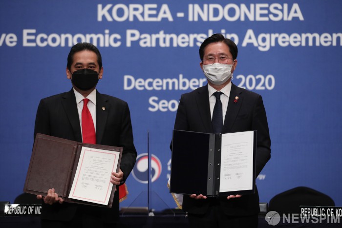 [서울=뉴스핌] 백인혁 기자 = 성윤모 산업통상자원부 장관(오른쪽)과 아구스 수파르만토(Agus Suparmanto) 인도네시아 무역부 장관이 18일 오전 서울 중구 롯데호텔에서 열린 한-인도네시아 CEPA(Comprehensive Economic Partnership Agreement Signing Ceremony) 서명식에서 협약서에 서명을 마친 뒤 기념촬영을 하고 있다. 한국과 인도네시아 양국은 역내포괄적경제동반자협정(RCEP)에 이어 포괄적 경제동반자협정(CEPA)까지 성사시키며 양국간 무역장벽을 크게 낮췄다. 2020.12.18 dlsgur9757@newspim.com