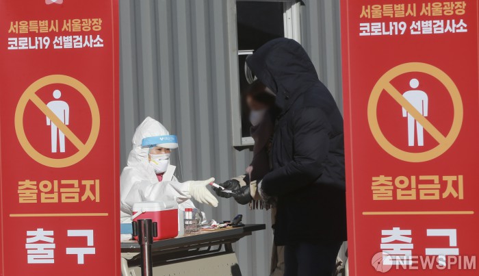 [서울=뉴스핌] 이형석 기자 = 코로나19 3차 대유행이 전국적으로 확산하는 가운데 19일 오전 서울 중구 서울광장에 마련된 임시선별검사소에서 시민들이 검사를 받고 있다. 중앙방역대책본부는 19일 코로나19 신규 확진자가 1053명 발생했다고 밝혔다. 2020.12.19 leehs@newspim.com