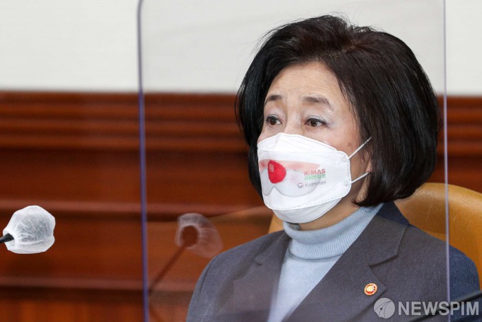 [서울=뉴스핌] 김학선 기자 = 박영선 중소벤처기업부 장관이 21일 서울 종로구 정부서울청사에서 열린 '제1차 혁신성장 BIG3 추진회의'에 참석해 'K-MAS 라이브마켓'을 알리는 문구가 적힌 마스크를 착용하고 있다. 2020.12.21 yooksa@newspim.com