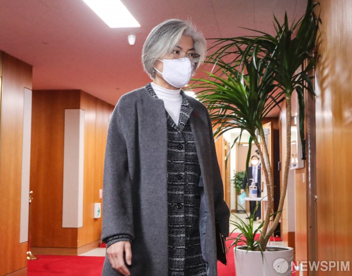 [서울=뉴스핌] 이한결 기자 = 강경화 외교부 장관이 24일 오후 서울 종로구 정부서울청사에서 열린 코로나19 백신·치료제 상황점검회의에 참석하고 있다. 2020.12.24 alwaysame@newspim.com