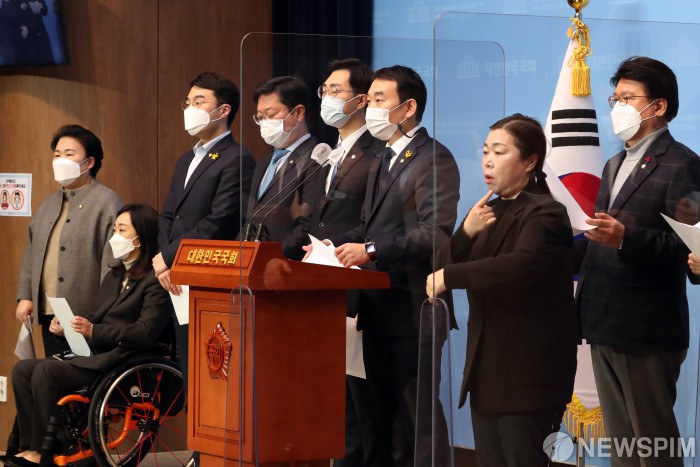 [서울=뉴스핌] 이형석 기자 = 김용민, 장경태 등 더불어민주당 의원들과 최강욱 열린민주당 대표가 29일 국회에서 공소청법 제정안, 검찰청법 폐지법률안 발의 기자회견을 하고 있다. 2020.12.29 leehs@newspim.com