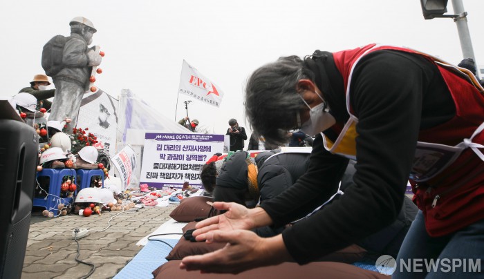 [서울=뉴스핌] 최상수 기자 = 29일 오전 서울 여의도 국회 앞에서 산업재해 관련 유가족, 시민사회단체들이 중대재해기업처벌법 제정 촉구를 위해 2400배를 하고 있다. 2020.12.29 kilroy023@newspim.com