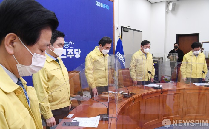 [서울=뉴스핌] 최상수 기자 = 이낙연 더불어민주당 대표와 김태년 원내대표등 최고위원들이 30일 오전 국회에서 열린 최고위원회의에서 고(故) 김근태 전 민주통합당 상임고문 9주기를 맞아 묵념을 하고 있다. 2020.12.30 kilroy023@newspim.com