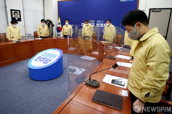 [서울=뉴스핌] 이형석 기자 = 이낙연 대표와 김태년 원내대표 등 최고위원들이 30일 국회에서 열린 더불어민주당 최고위원회의에 앞서 고(故) 김근태 전 상임고문 9주기를 맞아 묵념을 하고 있다. 2020.12.30 leehs@newspim.com