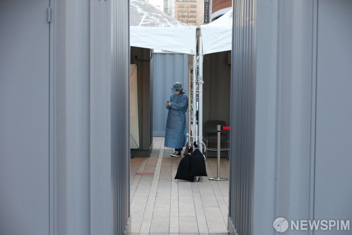 [서울=뉴스핌] 백인혁 기자 = '세밑한파'가 찾아온 30일 오전 서울 중구 서울시청 광장에 마련된 신종 코로나바이러스 감염증(코로나19) 임시 선별진료소에서 의료진이 컨테이너 사이에서 바람을 피하고 있다. 질병관리본부 중앙방역대책본부에 따르면 이날 0시 기준 국내 코로나19 신규 확진자는 1050명을 기록, 이틀째 1000명대를 이어갔다. 2020.12.30 dlsgur9757@newspim.com