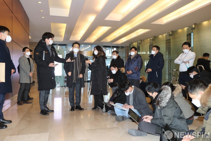 [서울=뉴스핌] 윤창빈 기자 = 김진욱 고위공직자범죄수사처장 후보자가 31일 서울 종로구의 한 빌딩에 마련된 인사청문회 준비 사무실로 출근하며 발언하고 있다. 2020.12.31 pangbin@newspim.com