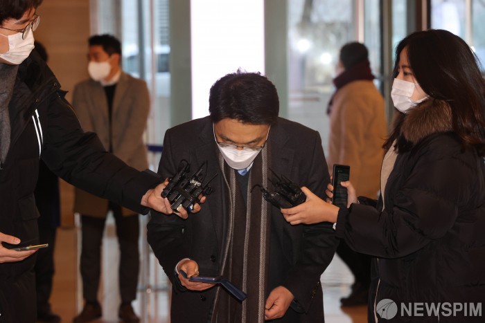 [서울=뉴스핌] 윤창빈 기자 = 김진욱 고위공직자범죄수사처장 후보자가 31일 서울 종로구의 한 빌딩에 마련된 인사청문회 준비 사무실로 출근하며 인사하고 있다. 2020.12.31 pangbin@newspim.com