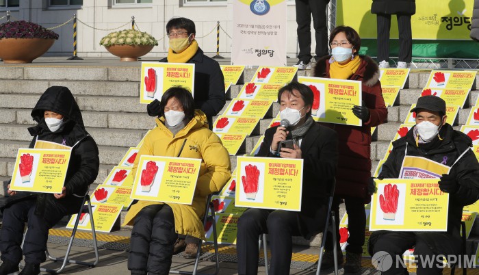 [서울=뉴스핌] 이형석 기자 = 김종철 정의당 대표가 1일 오전 서울 여의도 국회 본관 앞 단식농성장에서 열린 신년인사회에서 발언하고 있다. 왼쪽부터 고 김용균씨 어머니인 김미숙 김용균재단 이사장, 강은미 원내대표, 김종철 대표, 고 이한빛 PD 부친 이용관씨. 2021.01.01 leehs@newspim.com