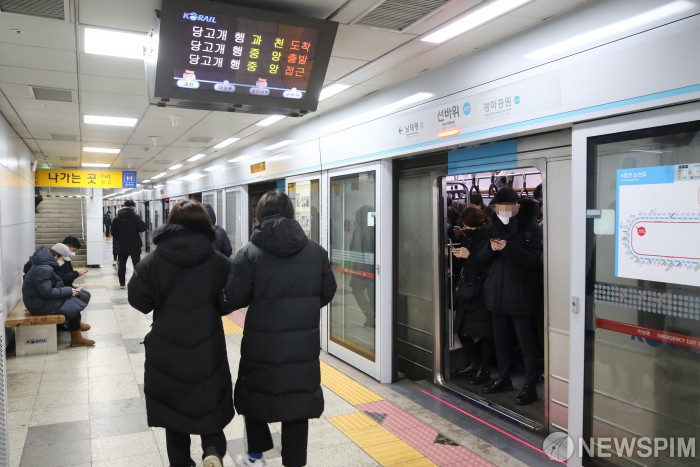 [과천=뉴스핌] 백인혁 기자 = 7일 오전 4호선 열차가 고장으로 운행이 일시중단 된 가운데 경기 과천시 선바위역에서 시민들이 다른 대중교통편 이용을 위해 이동하고 있다. 2021.01.07 dlsgur9757@newspim.com