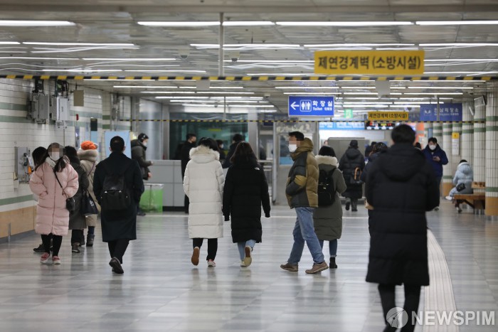 [과천=뉴스핌] 백인혁 기자 = 7일 오전 4호선 열차가 고장으로 운행이 일시중단 된 가운데 경기 과천시 선바위역에서 시민들이 다른 대중교통편 이용을 위해 이동하고 있다. 2021.01.07 dlsgur9757@newspim.com