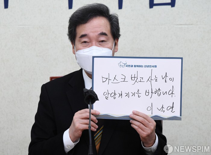 [서울=뉴스핌] 최상수 기자 = 이낙연 더불어민주당 대표가 7일 오전 국회 당대표실에서 문재인 대통령의 신년인사회에 화상으로 참석해 '마스크 벗고 사는 날이 앞당겨지기를 바랍니다' 손 팻말을 들고 기념촬영을 하고 있다. 정부 신년인사회는 '위기에 강한 나라, 든든한 대한민국'이라는 주제로 사회적 거리두기로 온 국민이 불편을 겪고 있는 상황임을 감안해 5부 요인과 주요 정당 대표, 특별초정 된 일반 국민 등 50여명이 온라인 영상회의 형식으로 신년 인사를 나눴다. 2021.01.07 kilroy023@newspim.com