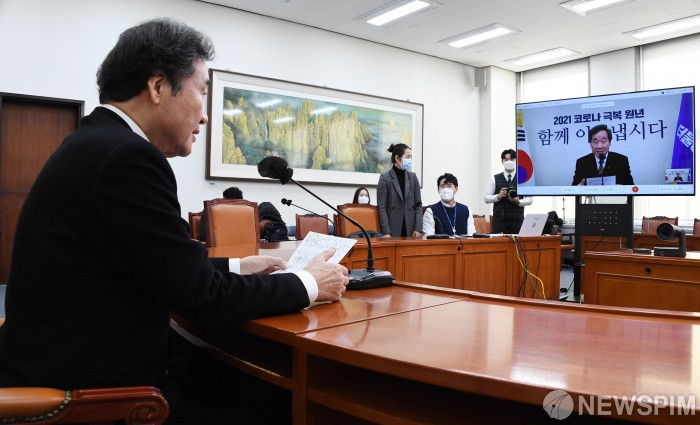[서울=뉴스핌] 최상수 기자 = 이낙연 더불어민주당 대표가 7일 오전 국회 당대표실에서 문재인 대통령의 신년인사회에 화상으로 참석해 인사말을 하고 있다. 정부 신년인사회는 '위기에 강한 나라, 든든한 대한민국'이라는 주제로 사회적 거리두기로 온 국민이 불편을 겪고 있는 상황임을 감안해 5부 요인과 주요 정당 대표, 특별초정 된 일반 국민 등 50여명이 온라인 영상회의 형식으로 신년 인사를 나눴다. 2021.01.07 kilroy023@newspim.com