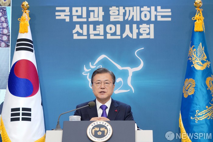 [서울=뉴스핌]문재인 대통령이 7일 오전 청와대에서 온라인 영상회의로 열린 '2021년 신년 인사회'에 참석 인사말을 하고 있다.[사진=청와대]2021.01.07.photo@newspim.com