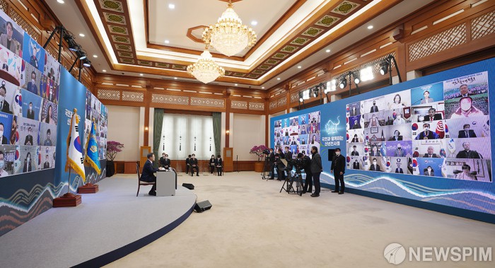 [서울=뉴스핌]문재인 대통령이 7일 오전 청와대에서 온라인 영상회의로 열린 '2021년 신년 인사회'에 참석 인사말을 하고 있다.[사진=청와대]2021.01.07.photo@newspim.com