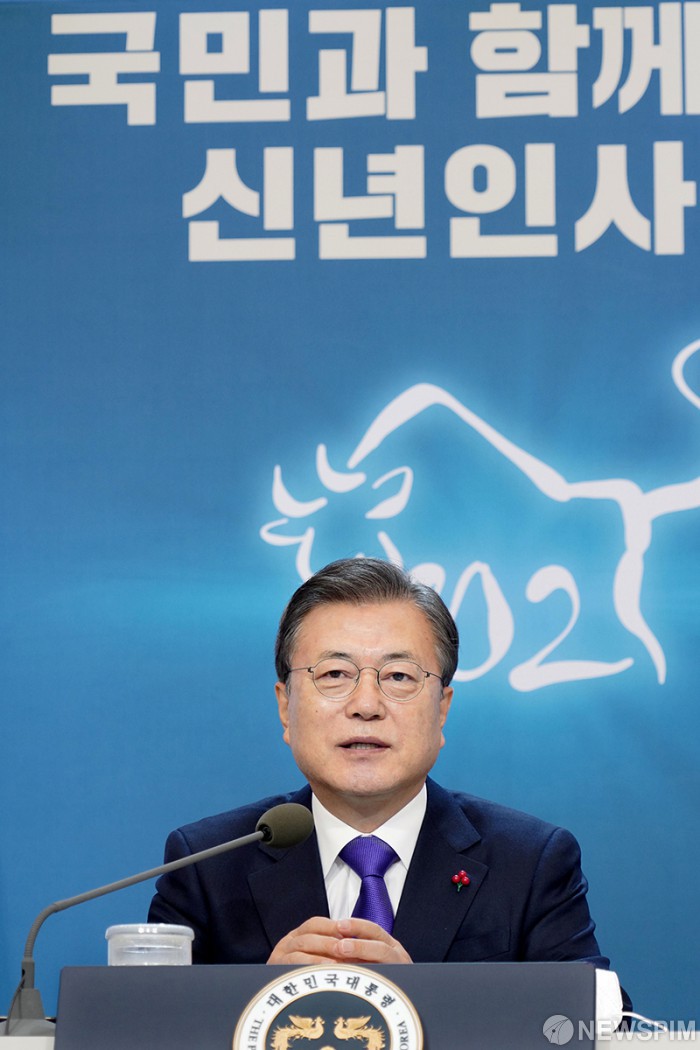 [서울=뉴스핌]문재인 대통령이 7일 오전 청와대에서 온라인 영상회의로 열린 '2021년 신년 인사회'에 참석 인사말을 하고 있다.[사진=청와대]2021.01.07.photo@newspim.com