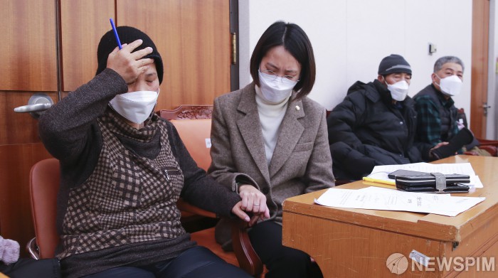 [서울=뉴스핌] 이형석 기자 = 고(故) 김용균씨의 어머니 김미숙 김용균재단 이사장이 8일 오전 서울 여의도 국회에서 열린 법사위 전체회의에서 5인 미만 사업장이 대상에서 빠진 중대재해에 대한 기업 및 책임자 처벌 등에 관한 법률안이 통과되자 괴로워 하고 있다. 2021.01.08 leehs@newspim.com