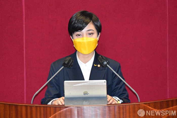 [서울=뉴스핌] 이형석 기자 = 류호정 정의당 의원이 8일 오후 서울 여의도 국회에서 열린 본회의에서 중대재해 처벌 등에 관한 법률안에 대해 토론하고 있다. 2021.01.08 leehs@newspim.com