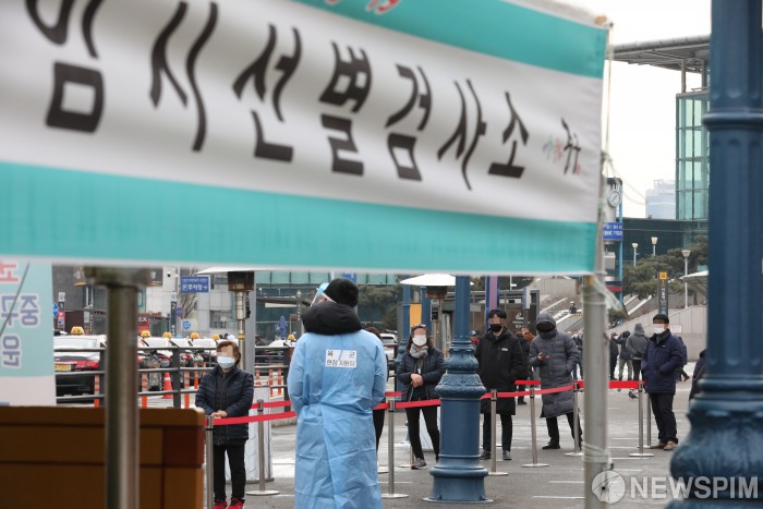 [서울=뉴스핌] 백인혁 기자 = 신종 코로나바이러스 감염증(코로나19) 신규 확진자 수가 41일만에 400명대로 떨어진 11일 오후 서울 용산구 서울역광장에 마련된 코로나19 중구 임시 선별검사소에서 시민들이 검사를 받기 위해 줄을 서고 있다. 2021.01.11 dlsgur9757@newspim.com