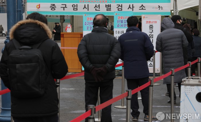 [서울=뉴스핌] 백인혁 기자 = 신종 코로나바이러스 감염증(코로나19) 신규 확진자 수가 41일만에 400명대로 떨어진 11일 오후 서울 용산구 서울역광장에 마련된 코로나19 중구 임시 선별검사소에서 시민들이 검사를 받기 위해 줄을 서고 있다. 2021.01.11 dlsgur9757@newspim.com
