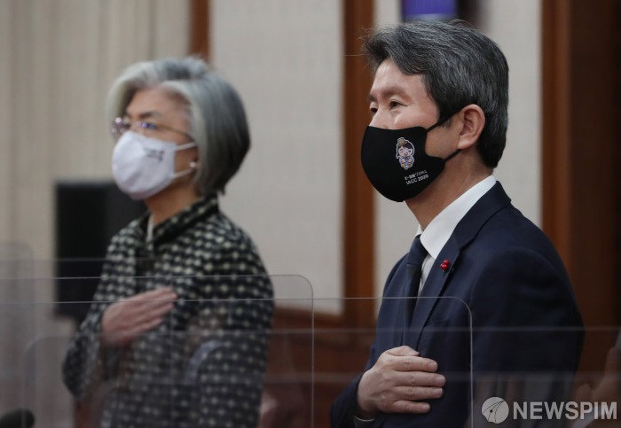 [서울=뉴스핌] 김학선 기자 = 이인영 통일부 장관과 강경화 외교부 장관이 12일 서울 종로구 정부서울청사에서 열린 국무회의에 참석해 국민의례를 하고 있다. 2021.01.12 yooksa@newspim.com
