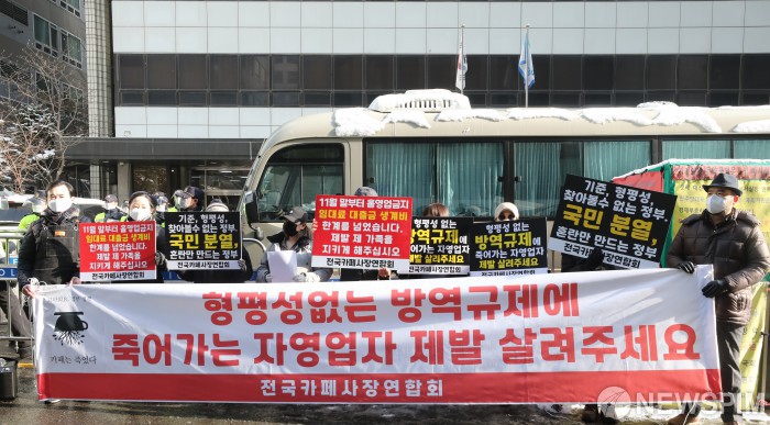[서울=뉴스핌] 백인혁 기자 = 전국카페사장연합회 회원들이 13일 오전 서울 여의도 더불어민주당사 앞에서 신종 코로나바이러스 감염증(코로나19)으로 인한 방역규제 완화 또는 재고를 촉구하는 집회를 하고 있다. 2021.01.13 dlsgur9757@newspim.com