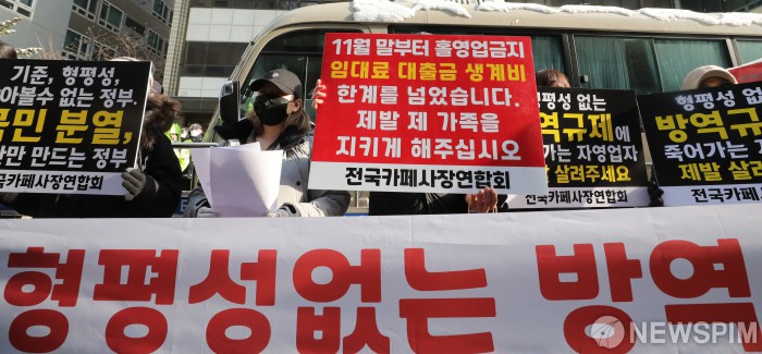 [서울=뉴스핌] 백인혁 기자 = 전국카페사장연합회 회원들이 13일 오전 서울 여의도 더불어민주당사 앞에서 신종 코로나바이러스 감염증(코로나19)으로 인한 방역규제 완화 또는 재고를 촉구하는 집회를 하고 있다. 2021.01.13 dlsgur9757@newspim.com