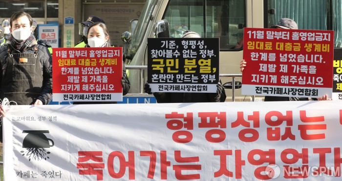 [서울=뉴스핌] 백인혁 기자 = 전국카페사장연합회 회원들이 13일 오전 서울 여의도 더불어민주당사 앞에서 신종 코로나바이러스 감염증(코로나19)으로 인한 방역규제 완화 또는 재고를 촉구하는 집회를 하고 있다. 2021.01.13 dlsgur9757@newspim.com