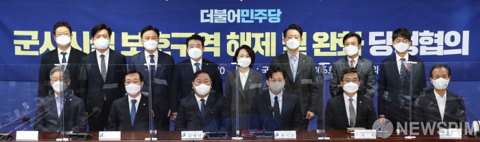 [서울=뉴스핌] 이형석 기자 = 김태년 더불어민주당 원내대표와 이재명 경기도지사, 서욱 국방부장관 등 참석자들이 14일 오전 국회 의원회관에서 열린 '군사시설 보호구역 해제 및 완화 당정협의'에서 기념촬영을 하고 있다. 2021.01.14 leehs@newspim.com