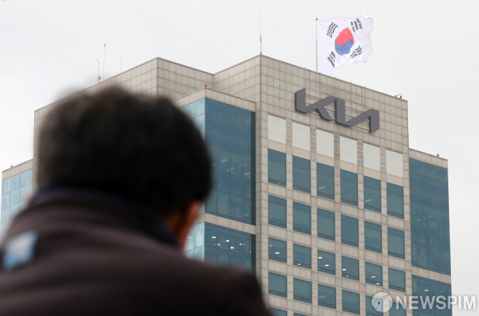 [서울=뉴스핌] 백인혁 기자 = 15일 오전 서울 서초구 기아자동차 본사 건물 외벽에 기아자동차의 새로운 로고가 걸려 있다. 이날 기아자동차는 글로벌 유튜브 채널을 통해 진행된 브랜드 쇼케이스에서 새로운 슬로건을 비롯해 브랜드 지향점과 전략 등을 발표했다. 2021.01.15 dlsgur9757@newspim.com