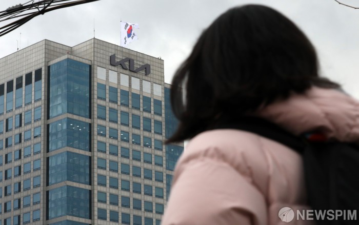 [서울=뉴스핌] 백인혁 기자 = 15일 오전 서울 서초구 기아자동차 본사 건물 외벽에 기아자동차의 새로운 로고가 걸려 있다. 이날 기아자동차는 글로벌 유튜브 채널을 통해 진행된 브랜드 쇼케이스에서 새로운 슬로건을 비롯해 브랜드 지향점과 전략 등을 발표했다. 2021.01.15 dlsgur9757@newspim.com