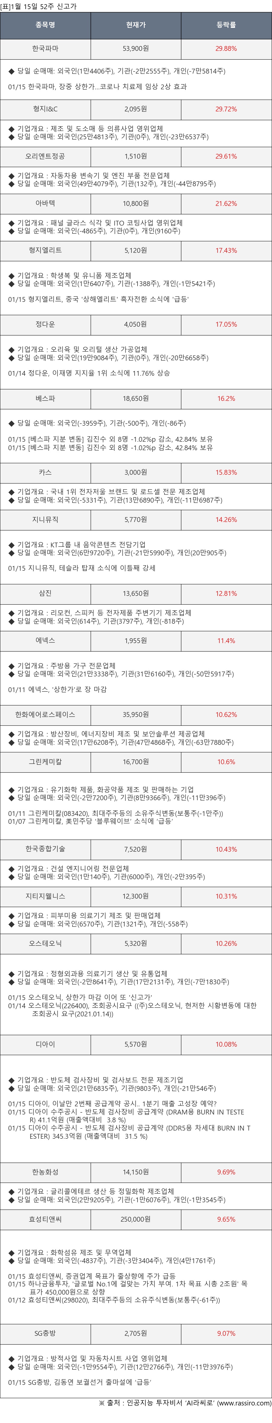 ※ 관련 종목: 한국파마, 형지I&C, 오리엔트정공, 아바텍, 형지엘리트, 정다운, 베스파, 카스, 지니뮤직, 삼진, 에넥스, 한화에어로스페이스, 그린케미칼, 한국종합기술, 지티지웰니스, 오스테오닉, 디아이, 한농화성, 효성티앤씨, SG충방