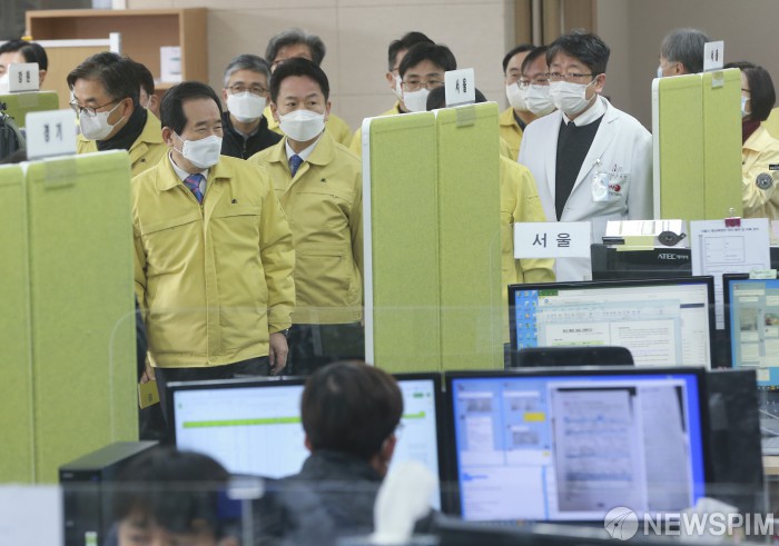 [서울=뉴스핌] 이형석 기자 = 정세균 국무총리가 16일 오전 서울 중구 국립중앙의료원에 마련된 중앙사고수습대책본부 코로나19 공동대응 상황실을 방문하고 있다. 2021.01.16 leehs@newspim.com