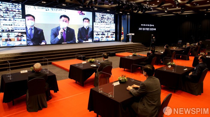 [서울=뉴스핌] 국회사진취재단 = 19일 오후 서울 여의도 중소기업중앙회에서 열린 중소기업인 신년 인사회에서 화상으로 참석한 중소기업 경영자들이 정세균 국무총리의 신년덕담에 화답하고 있다. 2021.01.19 photo@newspim.com