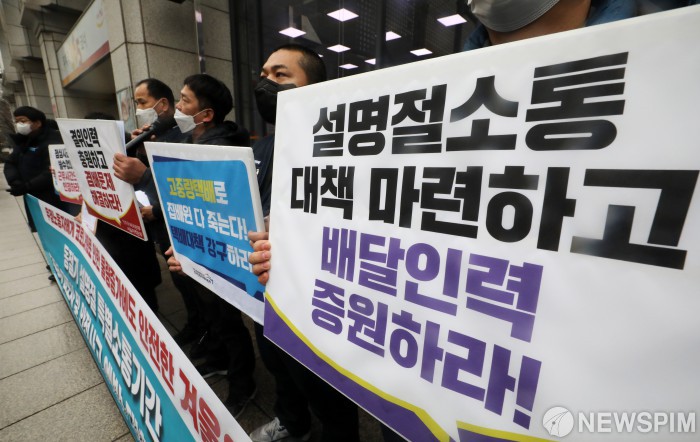 [서울=뉴스핌] 백인혁 기자 = 22일 오전 서울 종로구 광화문우체국 앞에서 열린 민주노총 공공운수노조 전국민주우체국본부 '동절기·설명절 특별소통기간 우정노동자 과로사 및 안전사고예방 대책요구 기자회견'에서 신순용 성북우체국 지부장이 발언하고 있다. 참가자들은 집배원들의 안전을 위해 배달인력 및 구분인력 증원, 과도한 택배물량 대책마련, 일몰 후 배달금지 등을 요구했다. 2021.01.22 dlsgur9757@newspim.com