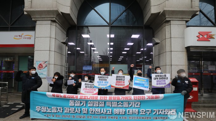[서울=뉴스핌] 백인혁 기자 = 민주노총 공공운수노조 전국민주우체국본부 조합원들이 22일 오전 서울 종로구 광화문우체국 앞에서 '동절기·설명절 특별소통기간 우정노동자 과로사 및 안전사고예방 대책요구 기자회견'을 열고 구호를 외치고 있다. 참가자들은 집배원들의 안전을 위해 배달인력 및 구분인력 증원, 과도한 택배물량 대책마련, 일몰 후 배달금지 등을 요구했다. 2021.01.22 dlsgur9757@newspim.com
