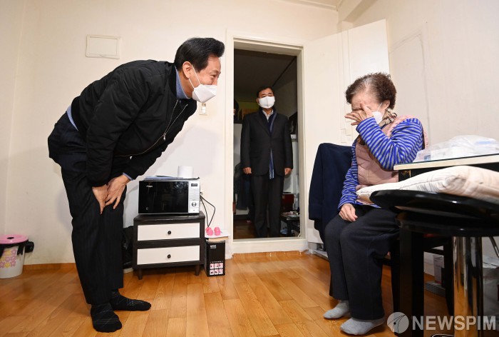 [서울=뉴스핌] 국회사진취재단 = 서울시장 보궐선거에 출마한 국민의힘 오세훈 전 서울시장이 22일 서울 중랑구 묵동에 거주 중인 1인 가구 어르신 집을 방문해 인사를 하고 있다. 2021.01.22 photo@newspim.com