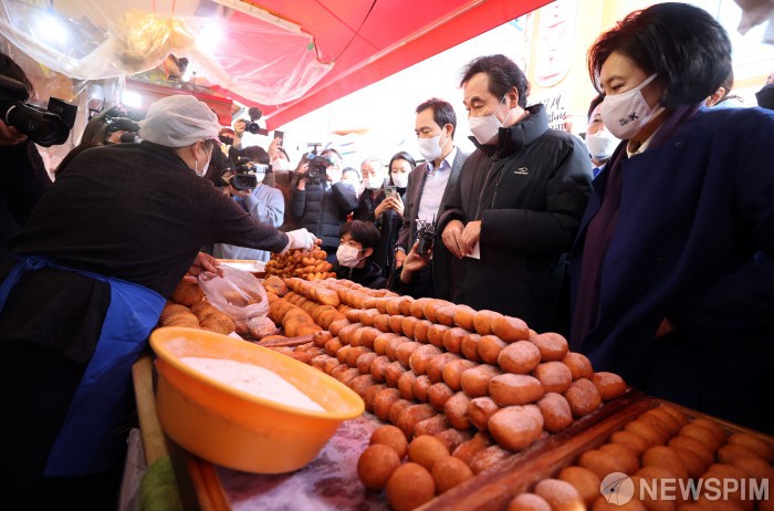 [서울=뉴스핌] 김학선 기자 = 23일 오전 서울 중구 남대문시장에서 더불어민주당 이낙연 대표와 서울시장 보궐선거 경선에 나서는 우상호 의원, 박영선 전 중소벤처기업부 장관이 꽈배기를 구입하고 있다. 2021.01.23 yooksa@newspim.com