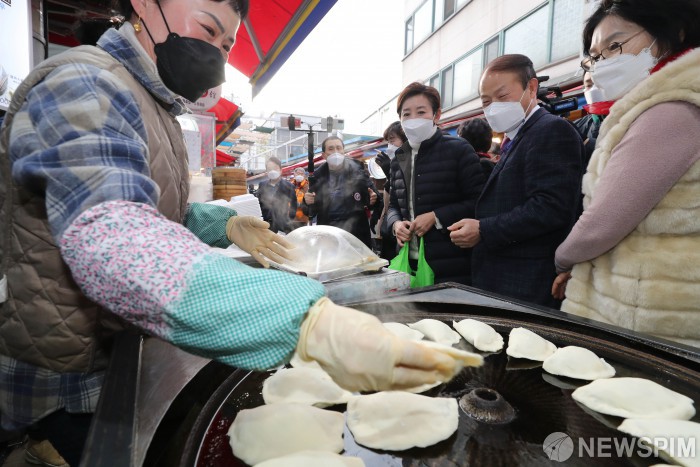 [서울=뉴스핌] 김학선 기자 = 서울시장 보궐선거에 출마한 나경원 국민의힘 전 의원이 23일 오후 서울 영등포구 대림중앙시장을 방문해 상인들과 인사를 나누고 있다. 2021.01.23 yooksa@newspim.com