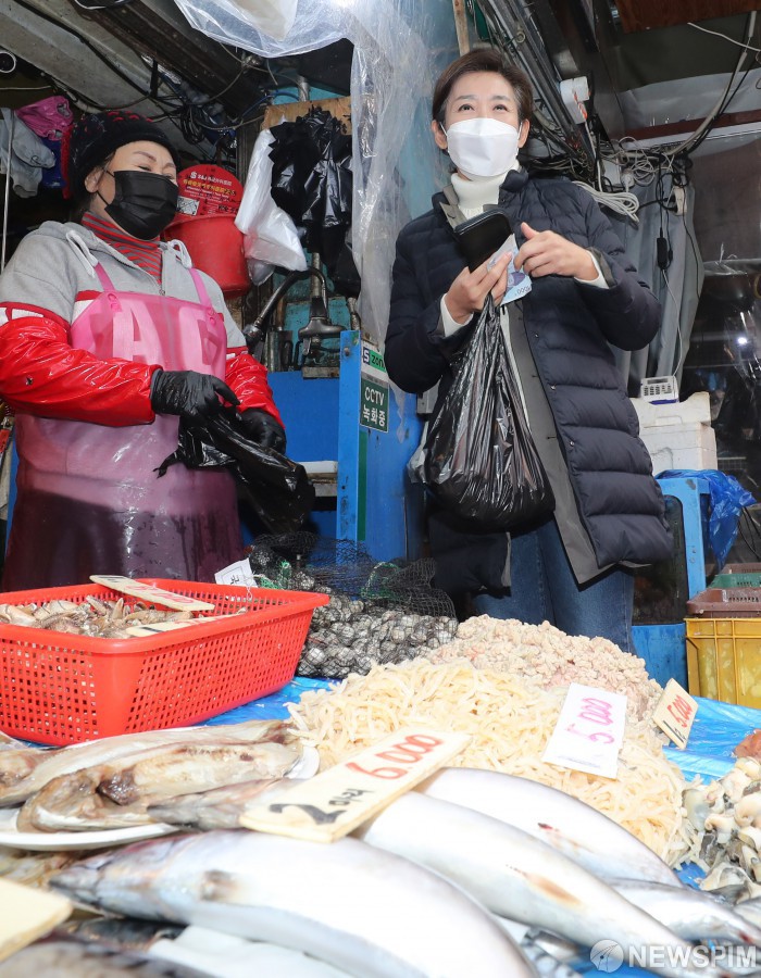 [서울=뉴스핌] 김학선 기자 = 서울시장 보궐선거에 출마한 나경원 국민의힘 전 의원이 23일 오후 서울 영등포구 대림중앙시장을 방문해 꼬막을 구입하고 있다. 2021.01.23 yooksa@newspim.com