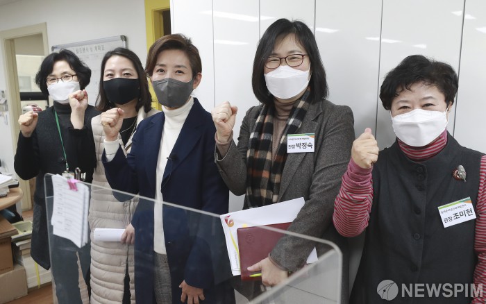 [서울=뉴스핌] 이형석 기자 = 서울시장 보궐선거에 출마한 나경원 국민의힘 전 의원이 26일 오후 서울 서대문구 여성인력개발센터에서 열린 여성일자리 현장 간담회에서 참석자들과 기념촬영을 하고 있다. 왼쪽부터 이숙완 서대문여성인력개발센터 국장, 서정연 구로여성인력개발센터 관장, 나 전 의원, 박정숙 서대문여성인력개발센터 관장, 조미현 동대문여성인력개발센터 관장. 2021.01.26 leehs@newspim.com