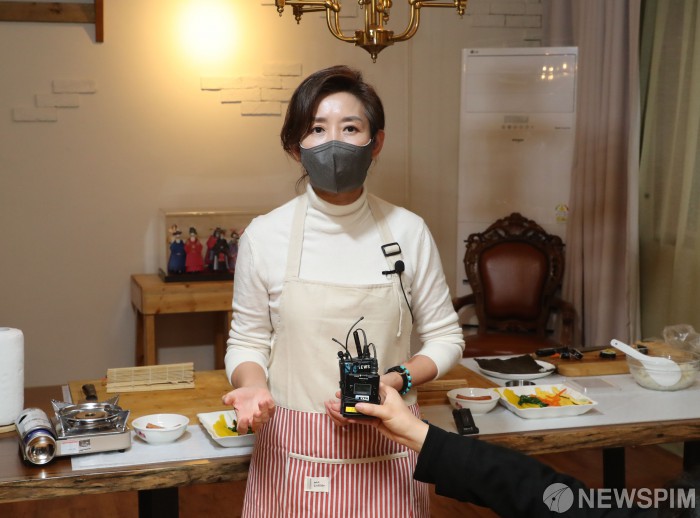 [서울=뉴스핌] 이형석 기자 = 서울시장 보궐선거에 출마한 나경원 국민의힘 전 의원이 26일 오후 서울 마포구 연남동 '바투 스테이'에서 여성일자리 현장 체험 프로그램에 참여한 뒤 인터뷰를 하고 있다. 2021.01.26 leehs@newspim.com