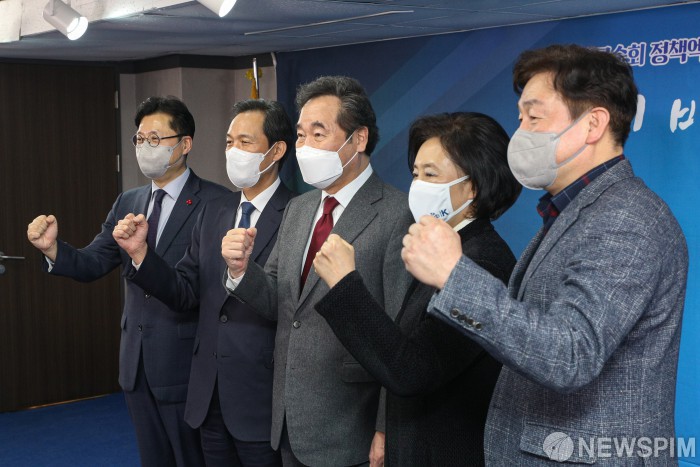 [서울=뉴스핌] 이형석 기자 = 이낙연 더불어민주당 대표와 서울시장 보궐선거에 출마한 우상호 의원, 박영선 전 장관 등 참석자들이 27일 서울 여의도 더불어민주당 서울시당에서 열린 '민주당 정책엑스포 in 서울'에서 기념촬영을 하고 있다. 2021.01.27 leehs@newspim.com