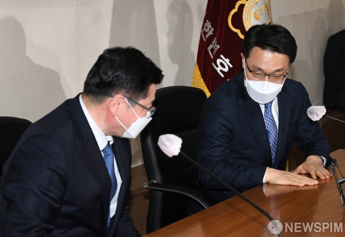 [서울=뉴스핌] 윤창빈 기자 = 김진욱 고위공직자범죄수사처장(오른쪽)이 27일 서울 강남구 대한변호사협회에서 이찬희 대한변호사협회장을 예방해 인사하고 있다. 2021.01.27 pangbin@newspim.com