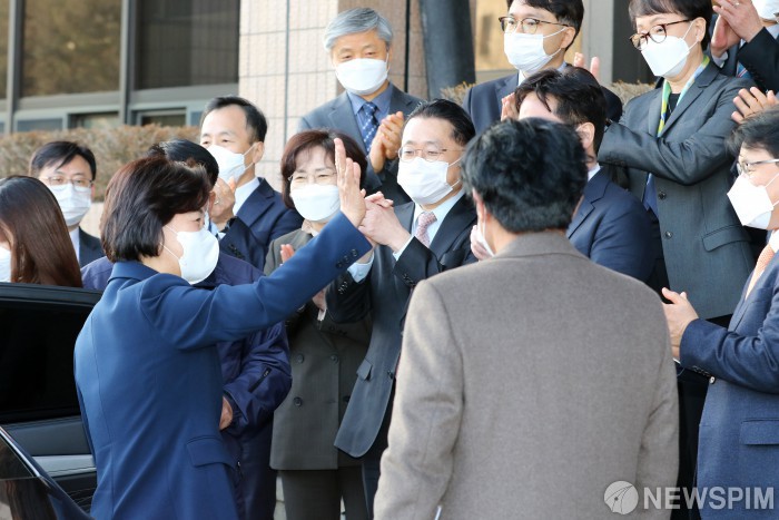 [과천=뉴스핌] 백인혁 기자 = 추미애 법무부 장관이 27일 오후 경기 과천시 정부과천청사 법무부에서 열린 이임식을 마치고 차량에 탑승 전 인사를 하고 있다. 2021.01.27 dlsgur9757@newspim.com