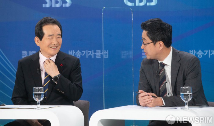 [서울=뉴스핌] 윤창빈 기자 = 정세균 국무총리가 28일 오전 서울 양천구 대한민국예술인센터에서 BJC 한국방송기자클럽 주최로 열린 초청토론회에서 참석자와 대화를 나누고 있다. 2021.01.28 pangbin@newspim.com