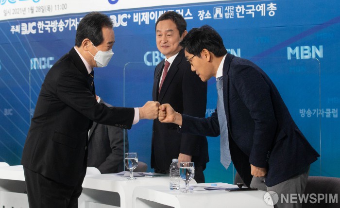 [서울=뉴스핌] 윤창빈 기자 = 정세균 국무총리가 28일 오전 서울 양천구 대한민국예술인센터에서 BJC 한국방송기자클럽 주최로 열린 초청토론회에서 참석자들과 인사를 나누고 있다. 2021.01.28 pangbin@newspim.com