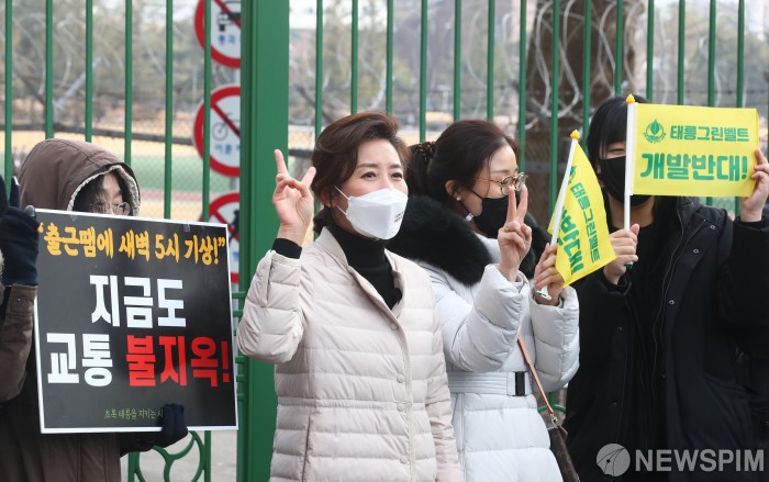 [서울=뉴스핌] 국회사진취재단 = 국민의힘 서울시장 예비후보인 나경원 전 의원이 31일 서울 노원구 태릉 골프장 입구에서 동북권 발전공약 발표를 마친 뒤 지지자들과 사진을 찍고 있다. 2021.01.31 photo@newspim.com