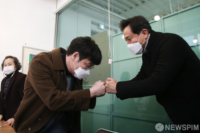 [서울=뉴스핌] 국회사진취재단 = 서울시장 보궐선거에 출마를 선언한 오세훈 국민의힘 예비후보가 2일 서울 종로구 아시테지 한국본부에서 공연연극계와의 간담회에서 참석자들과 인사하고 있다. 2021.02.02 photo@newspim.com